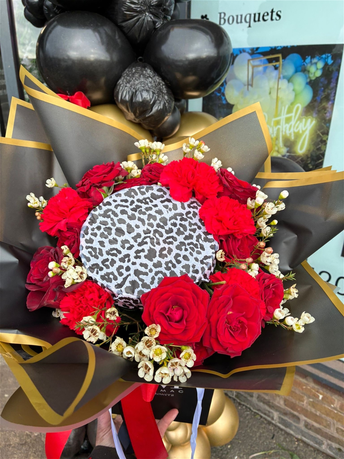 Our **Burn-to-Reveal Valentine Bouquet** is a full-on showstopper — luxe **red roses and seasonal blooms**, finished in our signature **black & gold wrap** with statement ribbons… and a **hidden message in the centre**.
