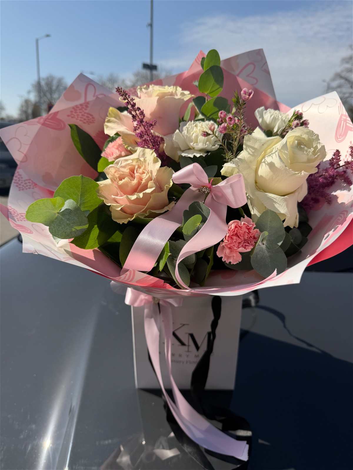 Blush Pearl is a soft, elegant hand-tied bouquet designed in delicate shades of blush pink and white for a timeless, feminine look. Featuring pink and white carnations, pink Mondial roses, a white rose, astilbe, waxflower, and fresh foliage, it has a lovely balance of texture, softness, and premium detail. It’s the kind of bouquet that feels thoughtful, pretty, and effortlessly luxurious.