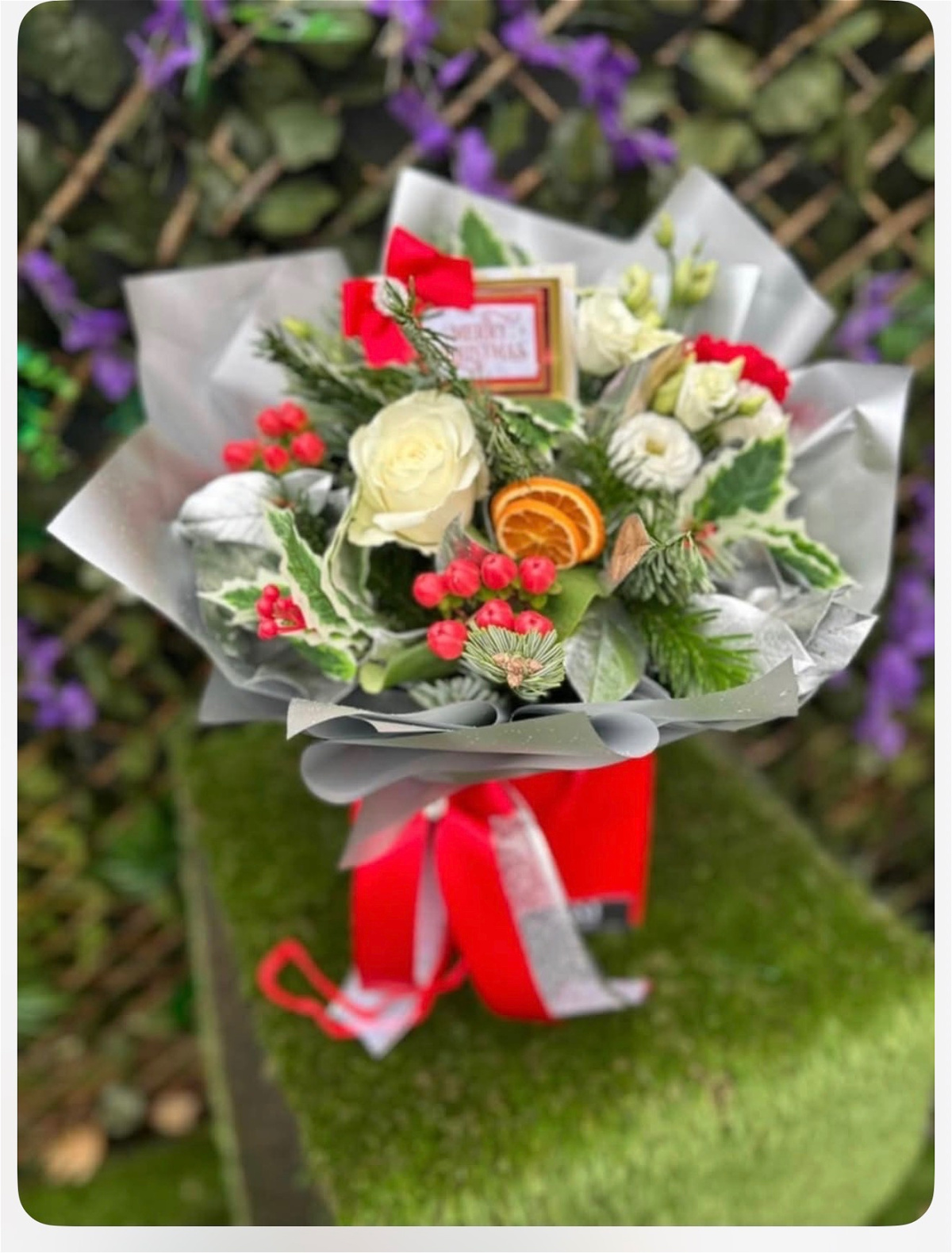 Our Christmas Cracker bouquet is bursting with festive cheer – classic red and white blooms, glossy berries, scented spruce and dried orange slices, all nestled in frosty silver wrap and a bold red gift box. The perfect little pop of Christmas magic for their table, desk or doorstep – ready to enjoy straight from the box.